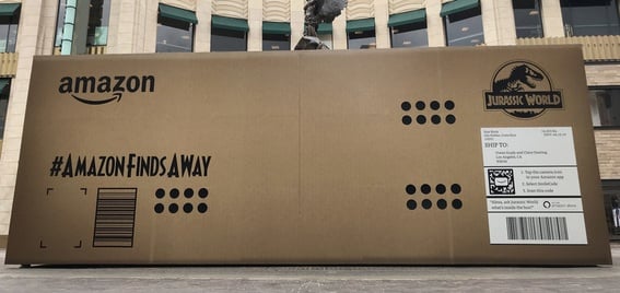 The 40-foot long box was adorned with air holes, the "Jurassic World" logo and a scannable SmileCode that unlocked content surrounding the film, which premiered on June 22. The massive package also featured the hashtag #AmazonFindsAWay to direct curious onlookers to social media and investigate what could be inside the box and buy tickets for the movie. For those that couldn't wait to crack the case of the box's contents, an Alexa-powered voice experience offered clues and dinosaur sounds when prompted with "Alexa, ask Jurassic Park what's in the box."