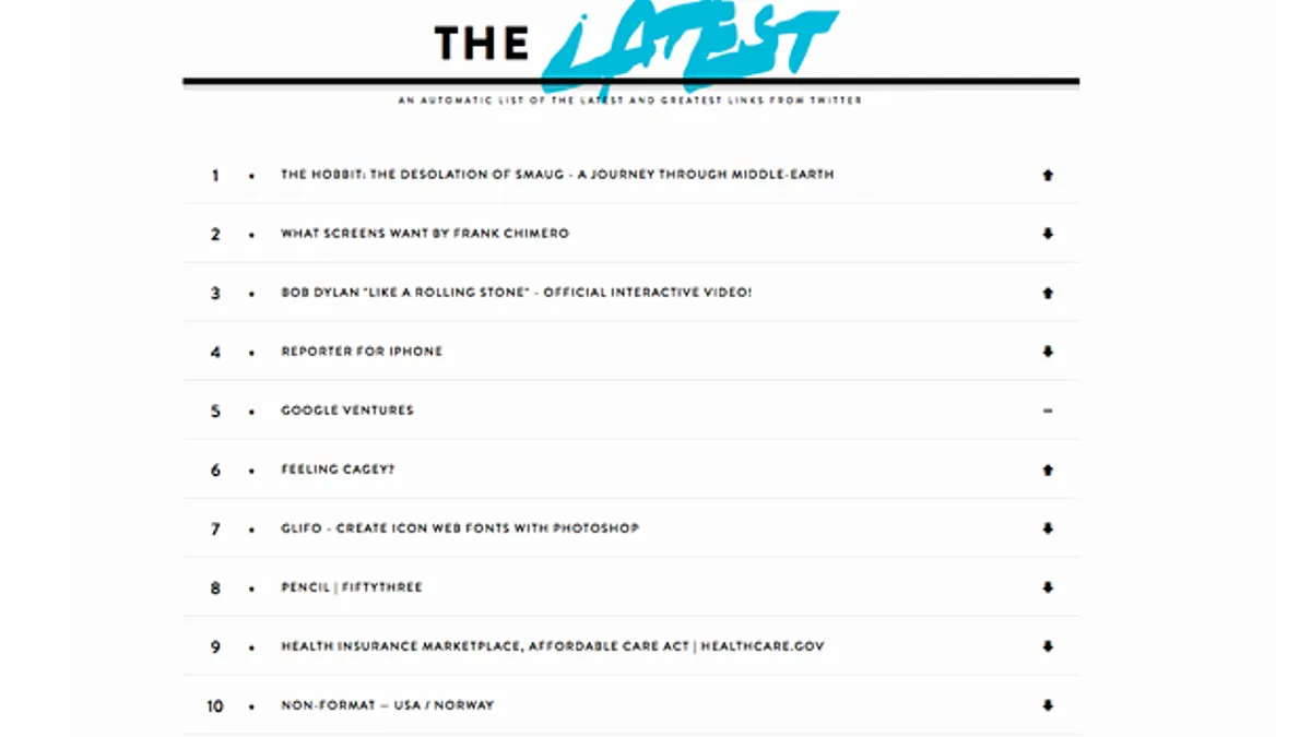 Too busy to keep up, even on Twitter? The Latest is the latest invention from Farfar/Blast Radius alumni Per Stenius (formerly known as Per Hansson, he took his wife's last name after getting married) and Oskar Sundberg, along with B-Reeler Bjarne Melin. It will keep you up to date on the most interesting happenings on the platform -- at least those things written by a group the creators have deemed to be the 1,000 most interesting people on Twitter. The site collects all their links and updates in real time the 10 most popular links among those.No time to go to the site? Follow @latest_is ...